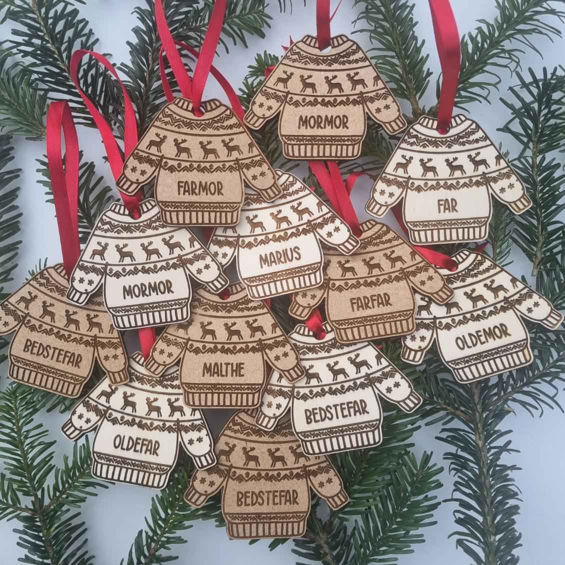 Gør juletræet personligt med en julesweater julekugle Denne julekugle formet som en lille julesweater i træ graveres med det navn, du ønsker. Hver julesweater skæres på bestilling og bliver en fast del af familiens julepynt år efter år. Juleophænget er fr